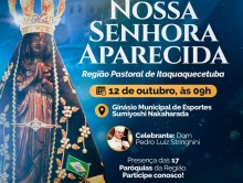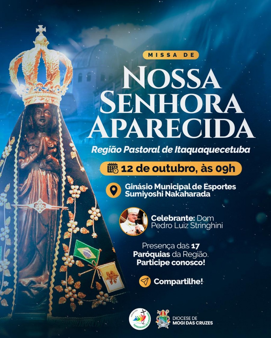 Neste domingo, dia 12 de outubro, Solenidade de Nossa Senhora da Conceição Aparecida, Padroeira do Brasil, às 9h, o bispo diocesano, Dom Pedro Luiz Stringhini preside a Santa Missa para a Região Pastoral Itaquaquecetuba, no Ginásio Municipal de Esportes Sumiyoshi Nakarada, localizado à Rua Santa Rita de Cássia, nº 129, no bairro Vila Japão, com a participação de todas as paróquias do munícipio.