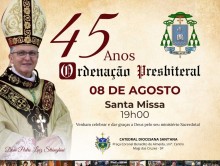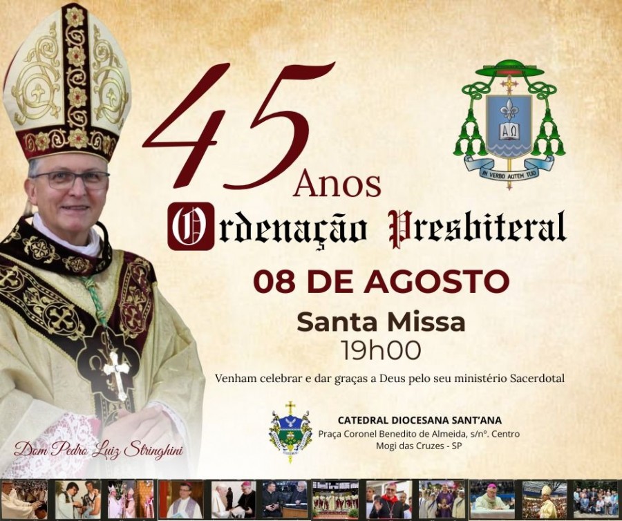 No dia 09 de agosto, Dom Pedro Luiz Stringhini completa 45 anos de Ordenação Sacerdotal. Para celebrar a data, a missa de Ação de Graças será nesta sexta-feira, dia 08 de agosto, às 19h, na Catedral Sant’Ana.