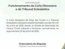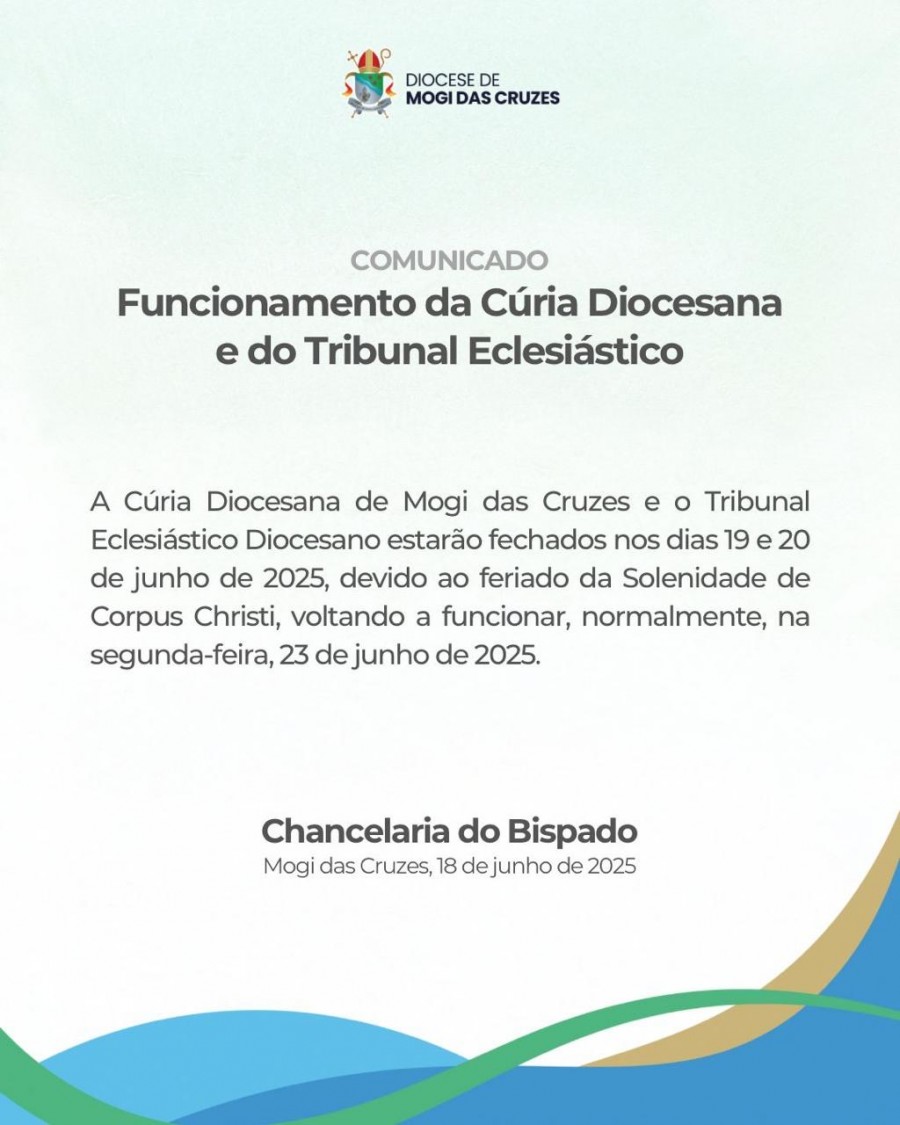 A Cúria Diocesana e o Tribunal Eclesiástico Diocesano não terão atendimento nos dias 19 e 20 de junho, em virtude da Solenidade do Santíssimo Corpo e Sangue de Cristo, Corpus Christi.