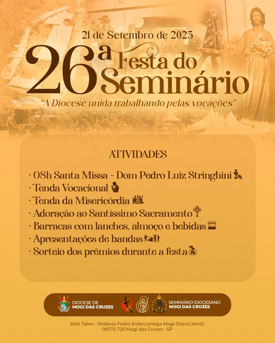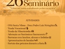 No dia 21 de setembro, acontece a 26ª Festa do Seminário Diocesano, sempre com o tema “Diocese Unida trabalhando pelas vocações”. O evento anual acontece no Sítio Tabor e a abertura é com Santa Missa no palco principal, às 8h, presidida pelo bispo diocesano, Dom Pedro Luiz Stringhini, e concelebrada pelos sacerdotes reitores e formadores do seminário.