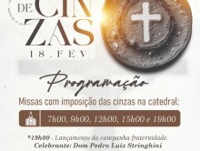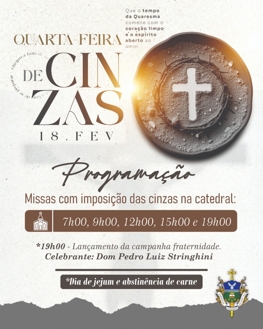 No dia 18 de fevereiro, às 19h, na Catedral Sant’Ana, o bispo diocesano, Dom Pedro Luiz Stringhini, preside a missa de Quarta-feira de Cinzas, e a abertura da Campanha da Fraternidade 2026 (CF 2026).